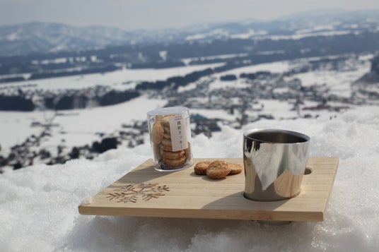 4.コーヒーを飲みながら休憩津南桐のプレートにのせたあったかいコーヒーとクッキーでブレイクタイム。