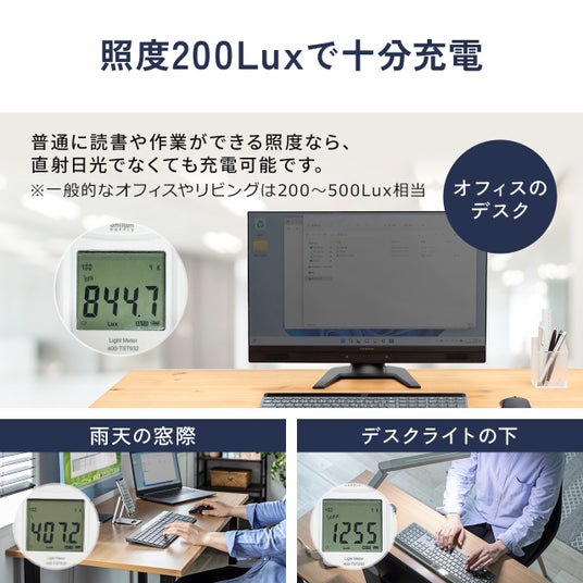 ●太陽光でなくても室内の照明で充電できるので、電池交換や充電作業が不要です。