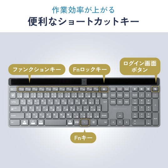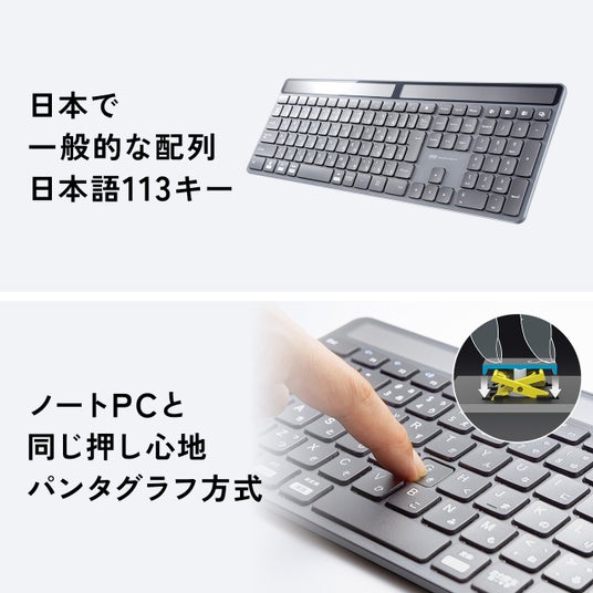 ソーラー充電 Bluetoothキーボード パンタグラフ 静音 テンキー付き フルキーボード Win Mac iOS対応 ワイヤレス 無線 日本語配列 マルチペアリング エコ グレー