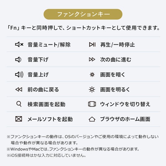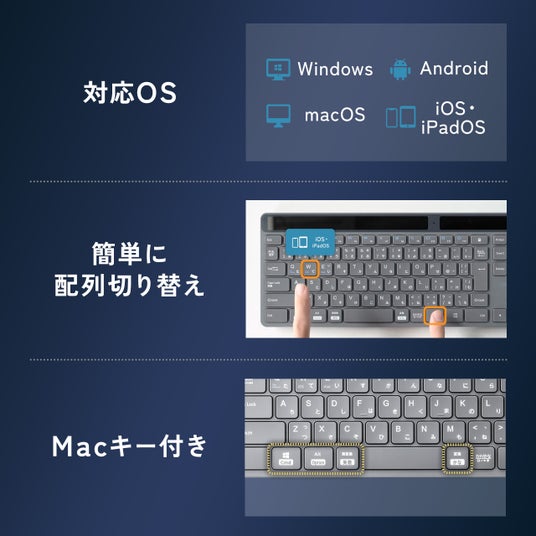 ・3台のマルチペアリングにも対応、WindowsだけでなくMac、iOS、Androidの配列に切り替えができる。