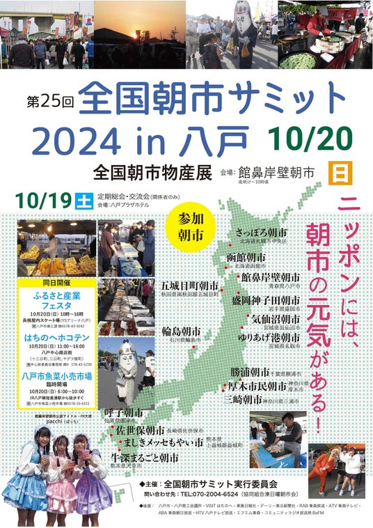 全国朝市サミット協議会は、2024年10月19日(土)と20日(日)の2日間にわたり、青森県八戸市を会場 に「全国朝市サミット2024 in 八戸」を開催いたします。同協議会の構成団体である、北海道から九州まで10の朝市が一堂に会し、朝市の情報発信や課題などについて話し合います。日曜日にあたる2日目は、八戸市の誇る全国最大規模の朝市「館鼻岸壁朝市」の開催日でもあり、朝市サミット開催に合わせて、協議会の構成団体による全国朝市物産展も行われます。