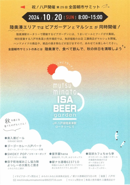 全国朝市サミットは1988年から延べ25回目の開催であり、八戸市での開催は2015年に続き2回目となります。また今回は、能登半島地震で被災した輪島朝市(石川県輪島市)の支援も大きなテーマとなっており、集客見込みは前回同市で開催された際を大きく上回る6万人です。