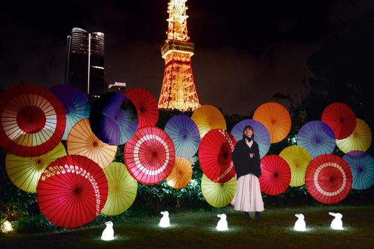 予約なしで立ち寄れる庭園で、東京タワーの絶景と強運カラーの和傘をバックに記念に残る1枚を。