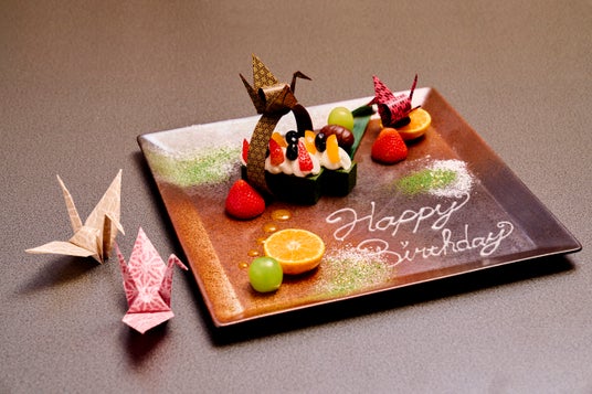 抹茶とホワイトチョコのテリーヌショコラにマスカルポーネクリームをデコレーション。甘すぎずさっぱりとした味わいです。ホテルのショコラティエの技術が光るチョコレートで作った折り鶴が、特別な記念日を彩ります。