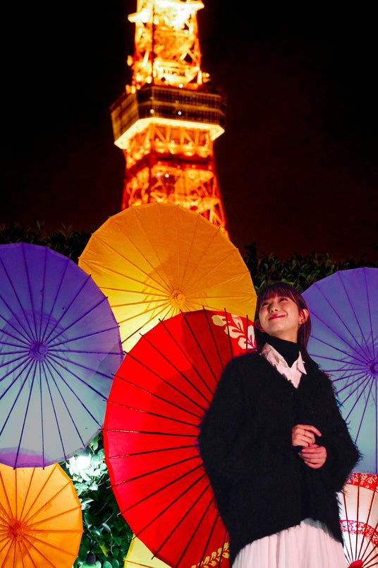 強運カラー6色をあしらった和傘と東京タワーの絶景