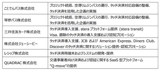 ことでんバス株式会社(本社:香川県高松市、代表取締役社長:石川 雅章)、琴参バス株式会社(本社:香川県丸亀市、代表取締役社長:佐藤 邦明)、三井住友カード株式会社(本社:東京都江東区、代表取締役社長:大西 幸彦)、株式会社ジェーシービー(本社:東京都港区、代表取締役兼執行役員社長:二重 孝好)、レシップ株式会社(本社:岐阜県本巣市、代表取締役社長:杉本 眞)、QUADRAC株式会社(本社:東京都港区、代表取締役社長:高田 昌幸)、は2025年2月18日より、香川県高松市内方面および丸亀・坂出方面と空港を結ぶ「高松空港リムジンバス」において三井住友カードが提供する公共交通機関向けソリューション「stera transit」を活用した、タッチ決済対応のカード(クレジット、デビット、プリペイド)や、カードが設定されたスマートフォン等による乗車サービスを開始いたします。