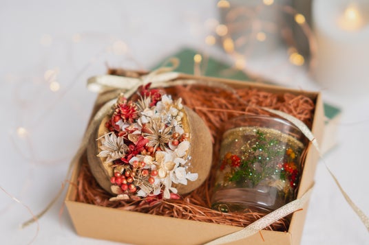『幸せを呼ぶ実』と言われるブッダナッツに、プリザーブドフラワーや木の実を組み合わせて作るブッダナッツアレンジと、透明なワックスでキラキラと輝くクリスマスを感じるジェルキャンドル作りがセットで楽しめる、クリスマスホリデイボックスです。
