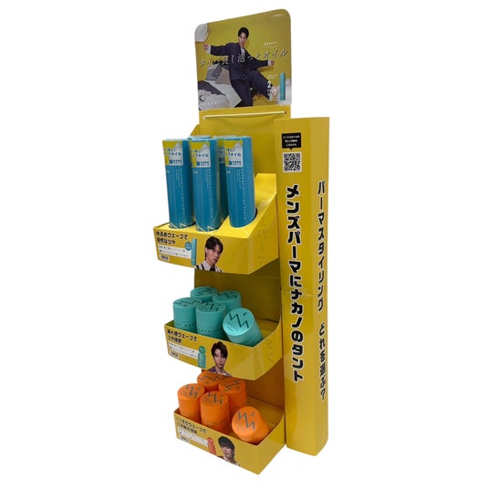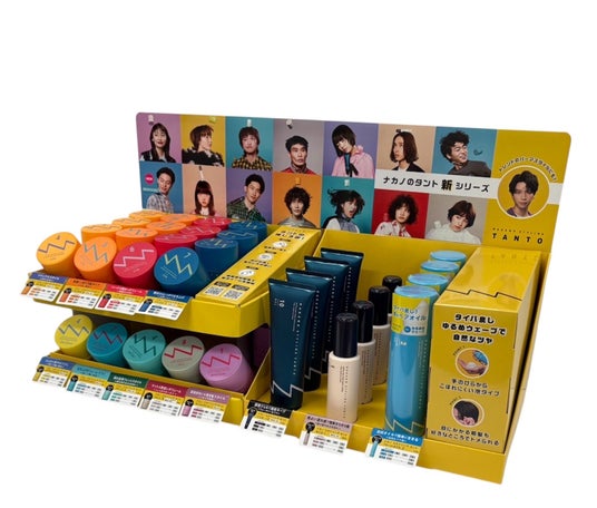 メンズパーマスタイリングに最適な3アイテム用のオリジナル什器を展開すると共に、「タント」計12アイテム販売什器も一新。スタイルごとのアイテムの違いを明確に訴求することで、自分らしい“なりたい姿”に合ったアイテム選定のサポートを強化します。