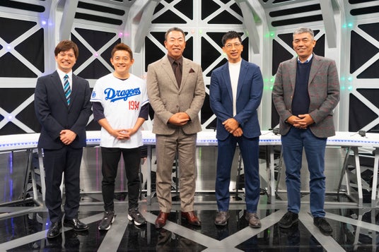 左から:島貫凌アナウンサー、井戸田潤(スピードワゴン)、中日ドラゴンズ・井上一樹新監督、ドラゴンズOB・矢野燿大氏、今中慎二氏
