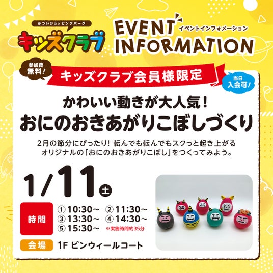 2025年1月4日(土)、1月5日(日)の2日間、税込5,000円以上(レシート合算可)のお買い上げ&「三井ショッピングパークポイント」LINE友だち追加・ららぽーと甲子園お気に入り施設登録で、2日間合計2025名さまにお年玉が当たる「新春お年玉おみくじ」や、1月11日(土)には「おにのおきあがりこぼしづくりワークショップ」、1月12日(日)には「キャラクター写真撮影会イベント」、1月13日(月・祝)には20歳を迎える記念に写真撮影ができる「セルフ写真館」設置など多数のイベントをご用意しています。