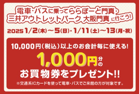 2025年1月2日(木)~1月5日(日)、1月11日(土)~1月13日(月・祝)の期間、乗車の際にご利用の交通系ICカードを館内の端末にタッチすると、もれなく10,000円(税込)以上のお会計ごとに使える1,000円分のお買物券をプレゼント!