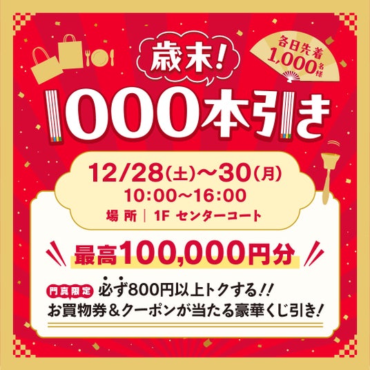 2024年12月28日(土)~12月30日(月)の3日間、バーゲン期間中も使えるお買物券が10人に1人10,000円分以上当たる、そして必ず800円分以上は得をするイベント「歳末!1000本引き」を開催いたします。最高100,000円分がゲットできるチャンスです!
