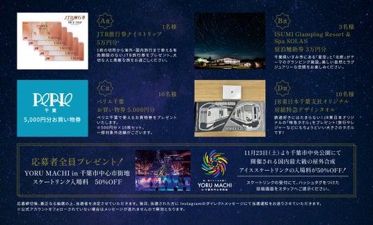 イベント公式アカウント@wishing_star_periechibaをフォローし、ハッシュタグ「#千葉の星は美しい」をつけて、千葉県内で撮影した星空写真をInstagramに投稿し素敵な投稿をしてくれた方に旅行券や千葉県グランピング施設利用券、JR東日本千葉支社オリジナル房総特急デザインタオル、応募者全員に千葉市中央公園にて開催中のYORU MACHIスケートリンク50%OFFなどをプレゼントいたします。