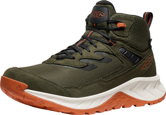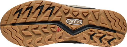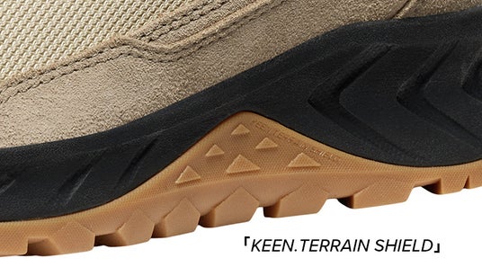 KEENは多用途で、耐久性に優れた持続可能なフットウェアを提案しています。ハイキングブーツとシューズの機能をハイブリッドした<HIGHTRAIL>コレクションのアッパーは、レザーとメッシュのコンビネーションで耐久性と通気性を両立。ミッドソールにはクッション性の高い高反発フォームを採用し、スポーティな履き心地を生み出します。アウトソールにはアスファルト、砂利道、岩場などの様々な地形で高いグリップ力を発揮する、全方向型アウトソールを採用。シャンクは搭載せず、アウトソールのラバーを中足部で巻き上げ、過度なねじれを抑制し、安定感とスムーズな推進力を生み出す「KEEN.TERRAIN SHIELD(キーン・テレインシールド)」を搭載。使用するパーツを減らすことは、エココンシャスなモノづくりにもつながります。