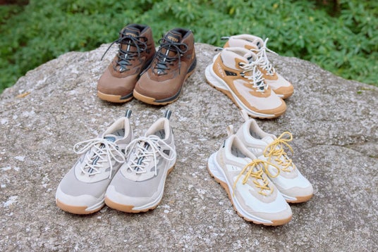 左奥より『HIGHTRAIL MID WP』DARK EARTH/OAK BUFF(メンズカラー)、SAFARI/CHIPMUNK(ウィメンズカラー)、手前左より『HIGHTRAIL WP』BRINDLE/BIRCH(メンズカラー)、BIRCH/DAFFODIL(ウィメンズカラー)