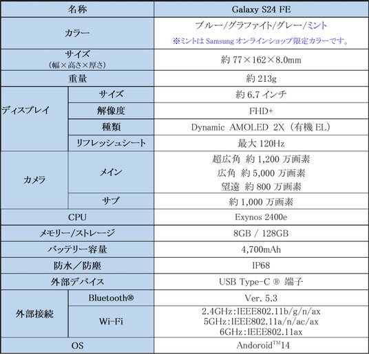 <主な仕様:「Galaxy S24 FE」>