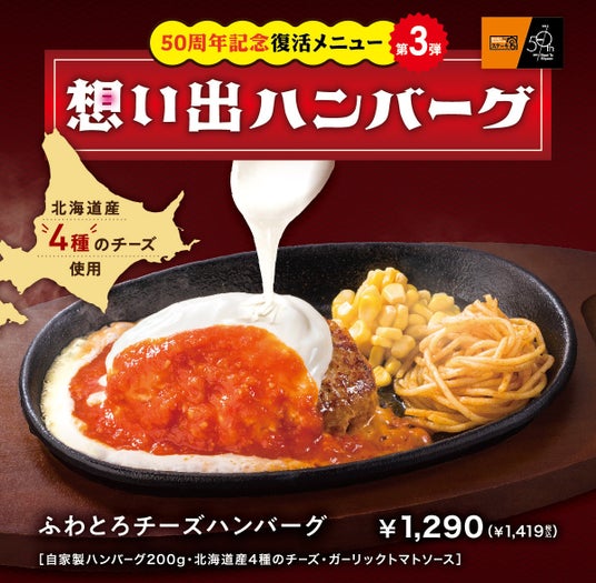心に残るあの味この味・・・。かつて愛されたハンバーグメニューを再現。懐かしさと新鮮さを楽しめる「想い出ハンバーグ」。2025年に迎える創業50周年を記念して、復活メニューシリーズ実施しております。そして、今回第3弾が登場です。