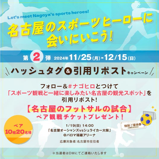 キャンペーン公式X「ナゴヒロ【名古屋のスポーツヒーローに会いにいこう】」(@nagohero_sports)をフォロー、キャンペーン投稿に「#ナゴヒロ」をつけて、引用リポストであなたの“スポーツ観戦”への想いをどんどん投稿してください。