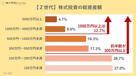 しかしながら、それよりも高い金額を回答した人も多く、およそ半数となる46.3%が、株式投資で300万円以上の資産を持っていることがわかりました。さらには、20代ですでに1000万円以上の資産を持っていると答えた人も38人(12.7%)いました。