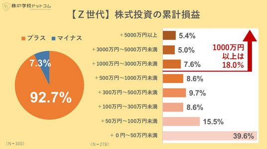 株式投資を始めてからこれまでの累計損益については、プラスの金額を回答した人が92.7%と圧倒的多数でした。20代の多くがこの数年以内に株式投資を始めているため、現在の株価上昇の恩恵をしっかりと受けているようです。プラスと答えた278人中、最も多かったのは「50万円未満」の39.6%でした。