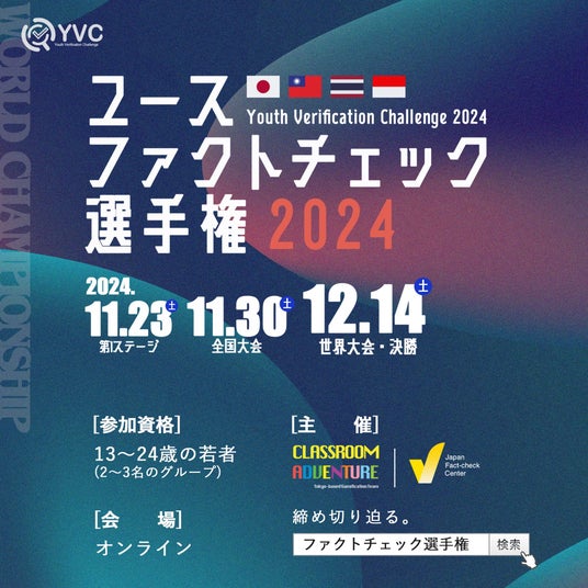 この度、株式会社Classroom Adventure (所在地: 東京都中央区 以下、Classroom Adventure) は日本ファクトチェックセンター(以下 JFC)ほか各国のファクトチェック団体との共催で、ファクトチェック(真偽検証)の技術を競う世界大会 Youth Verification Challenge 2024 (日本語名はユースファクトチェック選手権 2024)を開催します。