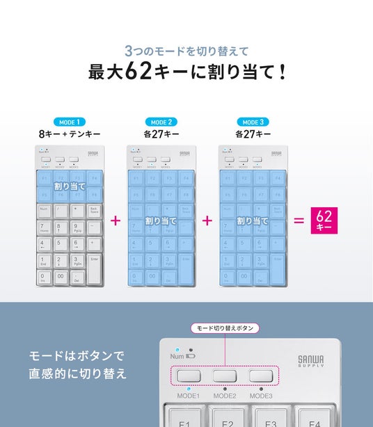 ・27キーに機能を割り当てられ、3つのモードで最大62キーに割り当てが可能