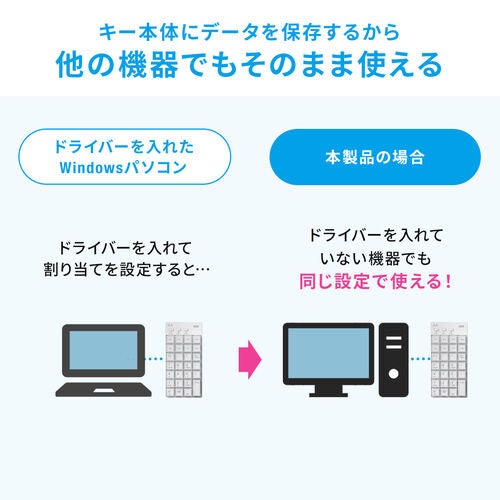 カスタマイズした設定はテンキー本体に保存されます。その為、ドライバーをインストールしていない他のパソコンでも保存した設定で使用することが出来ます。