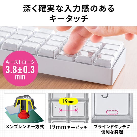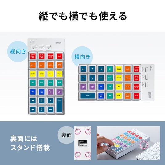 メンブレンキー方式を採用し、深く確実な入力感のあるキータッチになっています。また、縦向き・横向き両方に対応している為、設置場所や使い方を選びません。