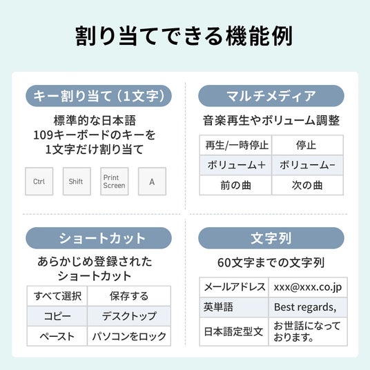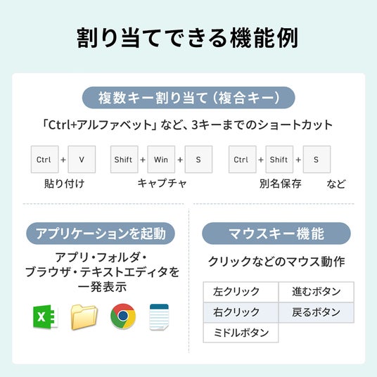 そのほか、アプリの起動機能やマウス操作、マルチメディア操作などが割り当てられます。