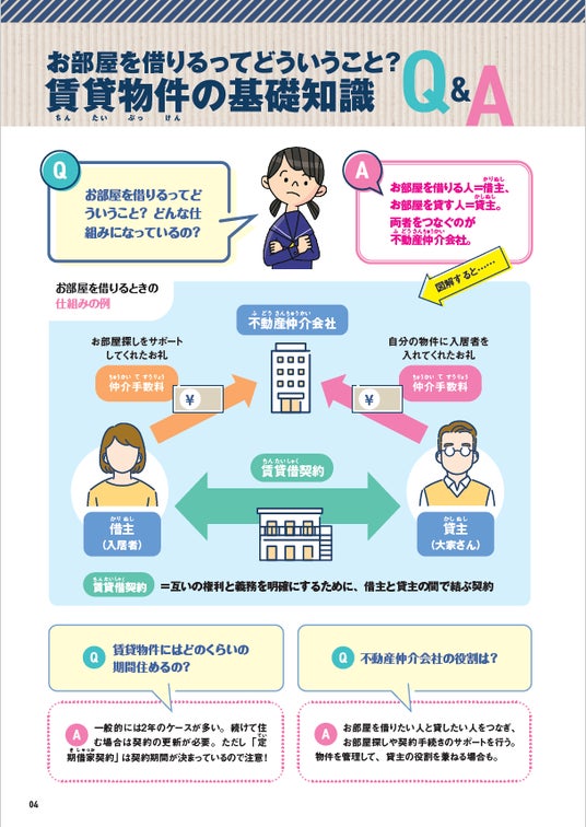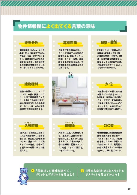 お部屋探しから引越しまでの流れだけではなく、お部屋探しに関する「用語解説」や「内見時のチェックポイント」など、一人暮らしを始める際に知っておくべき基礎知識も掲載。また、最新のトレンド情報や、お部屋探しのプロとしてCHINTAIが蓄積してきたトラブルを回避するためのポイントについても解説しており、高校生が実践的な知識を学び、将来に役立てられるものとなっています。