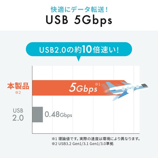 USB 3.2 Gen1対応のデータ転送速度で、最大5Gbpsの通信が可能。大量の写真や大容量動画も素早く転送できます。