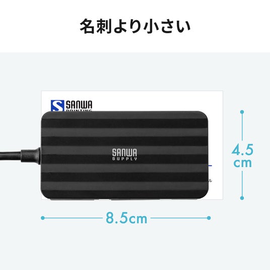 このマルチカードリーダーは、名刺サイズのコンパクトボディでわずか57g。持ち運びやすく、外出時や出張先での利用にも便利です。場所を取らずバッグやポケットにも収まり、必要なときにすぐに使える点も魅力です。