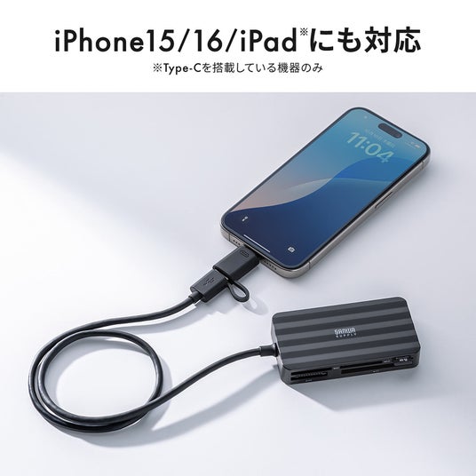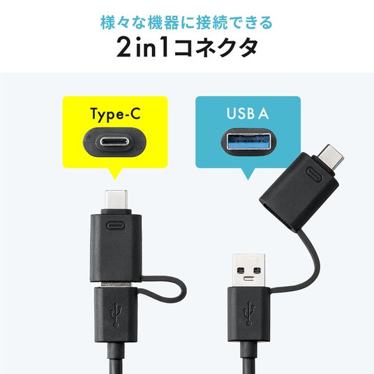 USB AとUSB-Cを備えた2 in 1コネクタは、最新のiPhone 16やiPadなどのUSB-C対応デバイスから、一般的なパソコンまで幅広く対応。家でも外出先でも、異なるデバイス間のデータ転送が可能です。
