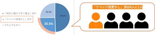 4人に1人が「リベンジ夜更かし」派。「明日に備えて早く寝る派」と比べ、寝つきに課題も。