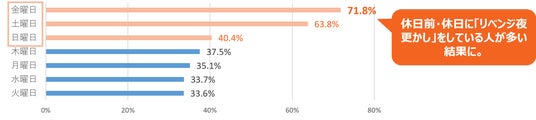 「リベンジ夜更かし」の行動実態を問う設問では、「リベンジ夜更かし」でしていることの第一位が 「動画視聴」で64.3%。第二位は「インターネットで調べもの」、第三位が「SNS」という結果に。「リベンジ夜更かし」をする理由としては、「なんとなくだらだらと夜更かしをしてしまう」が最も多く、次いで「気になるコンテンツが多く、楽しみたいから」でした。これらの回答をした人の普段の睡眠時間は5~6時という回答が多く、睡眠時間を短くしてでも楽しむ時間を作っているという傾向が見られました。また、「リベンジ夜更かし」をする曜日は、金曜日が一位、土曜日が二位という結果になっており、「リベンジ夜更かし」は休日前・休日に行われているということが分かりました。