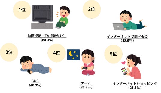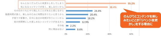「リベンジ夜更かし」派がついつい夜更かしをしてしまう理由で最も多かったのが「なんとなく」。リベンジ夜更かしでしていること第一位は「動画視聴」で64.3%。第二位は「インターネットで調べもの」。
