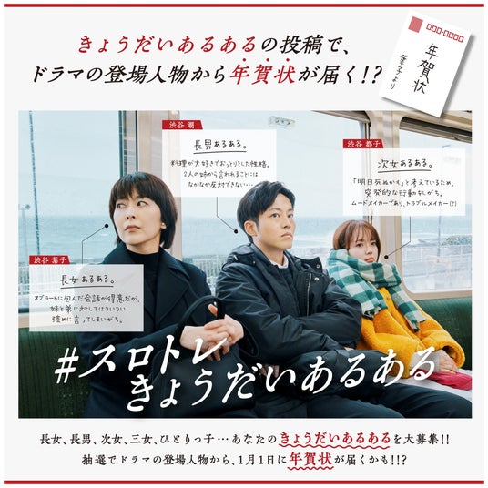 番組公式Xでは「きょうだいあるある」を一般の方々から募集するSNSキャンペーン「#スロトレきょうだいあるある」を実施。2300件を超える「きょうだいあるある」が投稿されました。投稿していただいた方の中から抽選で100名様に、3姉弟と百目鬼見(星野源)のうち、お好きな登場人物からの年賀状が1月1日(水・祝)に届きます。当選された方は、どんな年賀状なのかを、元旦の郵便受けで確認してみてください。