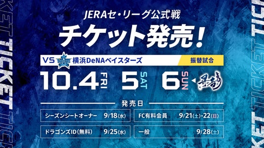 台風10号の影響により中止となりました8月30日(金)~9月1日(日)横浜DeNA戦は、10月4日(金)~6日(日)にバンテリンドームで振替開催いたします。