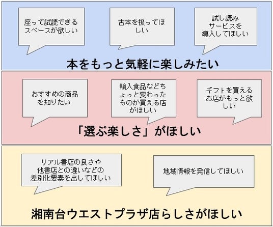した。また、「試し読みサービス」や「ギフトを買える店」「地域情報」を求める声も多く、より多くの方が気軽に本に触れられる場所、選ぶ楽しさ、地域のなかの拠点として店舗の独自性といった付加価