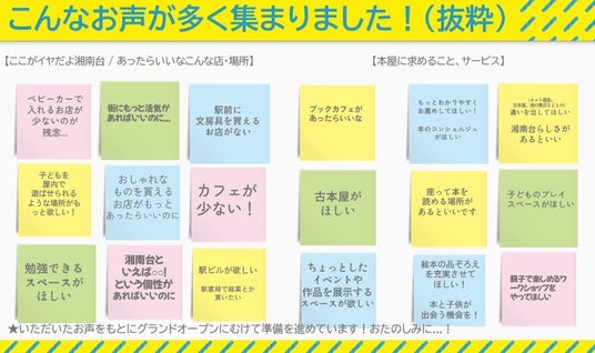 「湘南台まち会議」の結果を踏まえ、地域のニーズに応じた店舗づくりを進めてまいります。例えば、湘南台らしさのあるコーナー展開や、絵本の読み聞かせ、知育玩具の体験イベントを開催する予定です。今後は、「湘南台まち会議」の継続開催を検討し、地域に根差した店づくりを目指して取り組んでまいります。