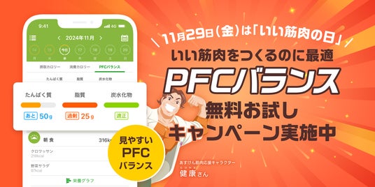 累計会員数1,100万人超・国内No.1*¹のAI食事管理アプリ『あすけん』の開発・運営を行う株式会社asken(東京都新宿区、代表取締役社長 中島洋、以下「当社」)は、2024年11月29日(金)の「いい筋肉の日」を記念して(※1)、『あすけん』アプリ内で“いい筋肉を作るために意識したい”「PFCバランス」が簡単に確認できる機能を無料でお試しいただけるキャンペーンを期間限定で開催いたします。
