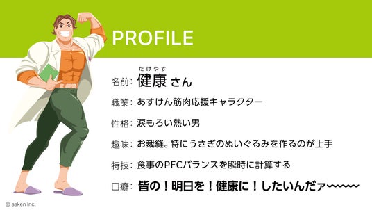 また、あすけん筋肉応援キャラクター「健康(たけやす)さん」が『あすけん』アプリ内に初登場します。