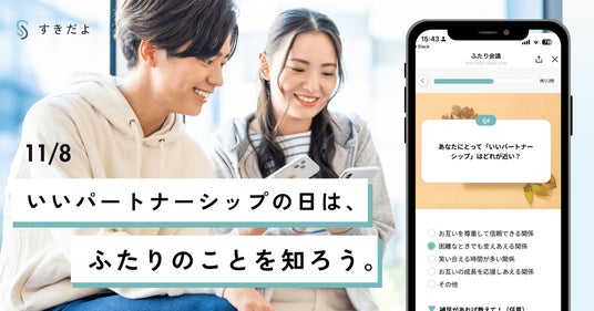 カップル・夫婦の関係性悪化を予防するカップルTechアプリ「ふたり会議」を開発する株式会社すきだよ(所在地:東京都豊島区、代表取締役社長:あつたゆか)では、11月8日(金)から11/15(金)までの期間限定で、「いいパートナーシップの日」にちなんだ限定質問の公開、公式Xでのプレゼント企画を実施いたします。