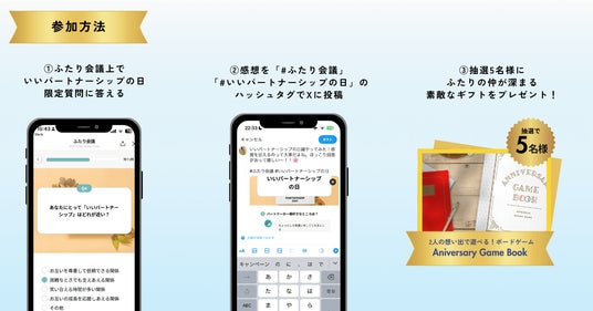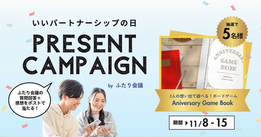 ふたり会議上で「いいパートナーシップの日」限定質問をパートナーと回答し、感想をポストした方から抽選で5名様にふたりの思い出で遊べるボードゲーム「Aniversary Game Book」が当たります。