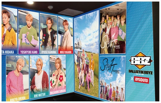 JOYSOUND品川港南口店(東京)・JOYSOUNDなんば戎橋店(大阪)・JOYSOUND博多口駅前店(福岡)に展開するカラオケコラボルームは、ルーム内の壁面やテーブル、ドアに至るまで、「BALLISTIK BOYZ」の世界観で彩られ、ファンには堪らない空間となっております。また、JOYSOUND品川港南口エントランス壁面には、巨大ビジュアルを展示いたします!