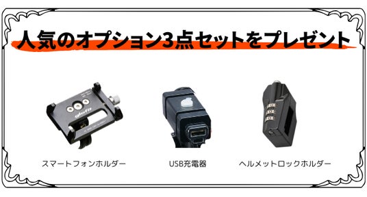 内容:キャンペーン期間中、電動サイクルNFR-01Proをご購入いただくと、人気オプション3点セット(スマートフォンホルダー、USB充電器、ヘルメットロックホルダー)をもれなくプレゼントいたします。