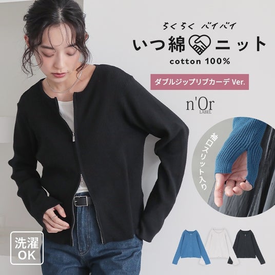 n'OrLABEL綿ニットダブルジップリブカーディガン