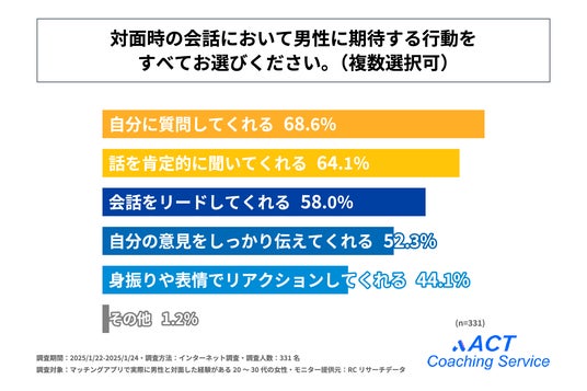 続いて「対面時の会話において男性に期待する行動」を尋ねる設問への回答では、1位が「自分に質問してくれる」で68.6%、2位が「話を肯定的に聞いてくれる」で64.1%、3位が「会話をリードしてくれる」で58.0%という結果となりました。この結果から、20代~30代の女性が対面時の会話において男性に期待することは、総じて「自分を尊重してくれること」であることが判明しました。