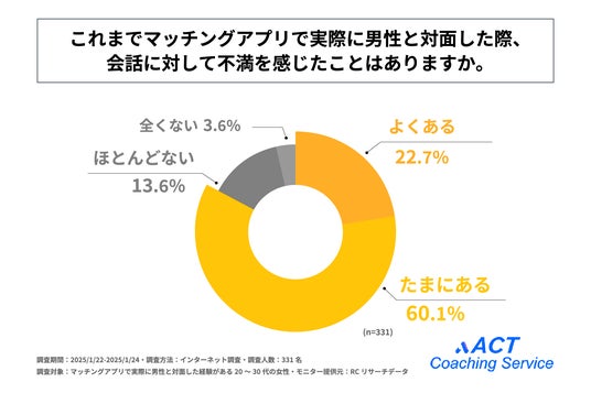 ・20代~30代の女性の8割以上が、マッチングアプリで実際に男性と対面した際、会話に関して不満を感じたことがある