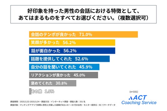 また「好印象を持った男性の会話における特徴」を尋ねる設問の回答で多かったのは、1位が「会話のテンポ良かった」で71.0%、2位が同率で「笑顔が多かった」と「話が面白かった」で56.2%という結果になりました。また、3位以降も回答率40%以上の回答が複数並ぶ結果となり、好印象を持った男性の会話における特徴は様々あることが明らかになりました。